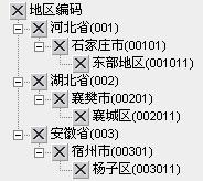 例如:代码名称为地区代码,子代码规则为3-2-1,子代码含义分别为省-市-地区,已经录入的代码值为:河北省(001)石家庄市(01)东部地区(1)、湖北省(002)襄樊市(01)襄城区(1)、安徽省(003)宿州市(01)杨子区(1),则代码树显示如下: